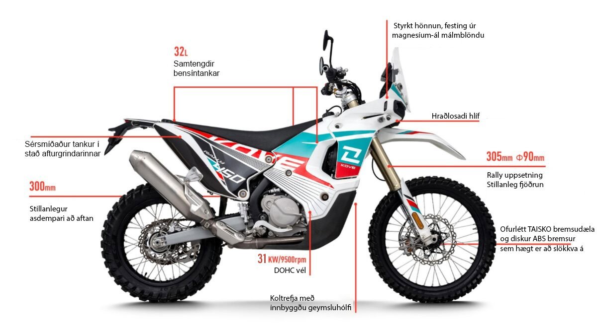 Útlitið er einstaklega aðlaðandi – Kove 450 Rally sameinar ástríðuna fyrir keppni við hagnýta eiginleika fyrir ævintýragjarna ferðalanga.