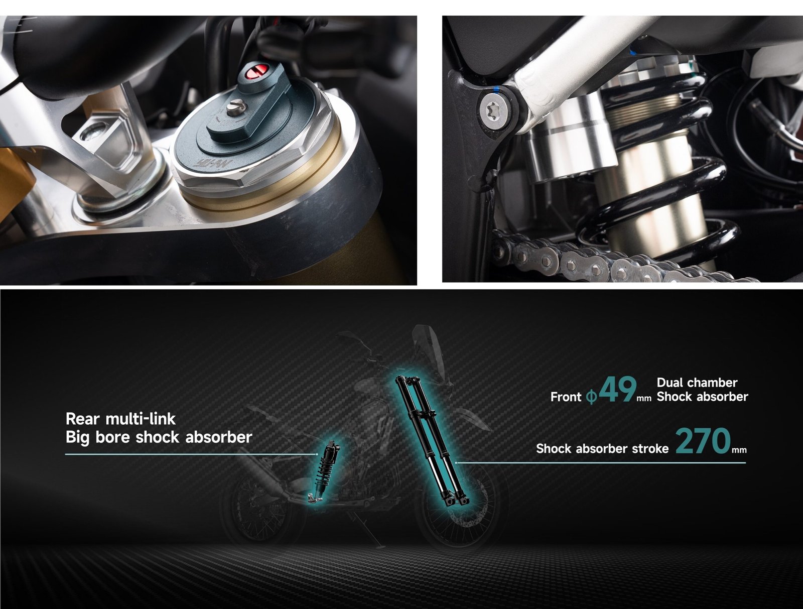 – fjöðrun með 270 mm slag að framan og 250 mm að aftan